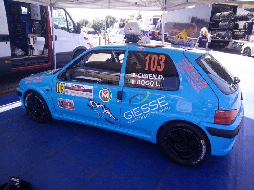 La macchina è la “puffetta” Peugeot 106 N2 del Team Autocar, gestita da Ales Menegol, appena rifatta dopo che era andata bruciata al Rally di Bassano lo scorso anno.