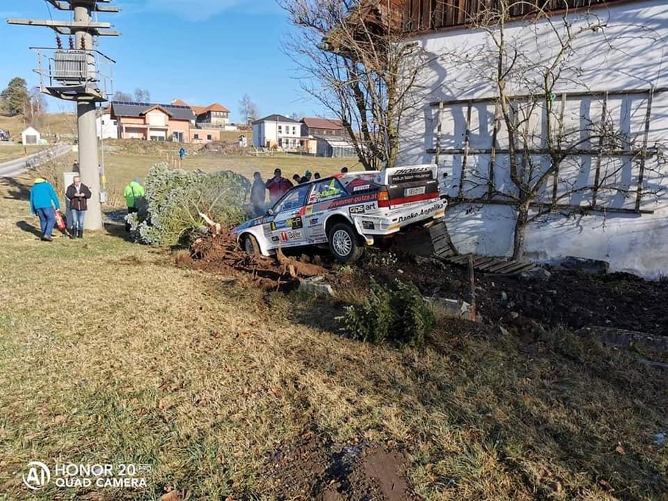 Una progressione a velocità piuttosto sostenuta e il rumore dell’Audi che racconta come il driver perda il controllo della vettura molto prima della curva all’altezza della casa. Segue uscita di strada, impatto violentissimo contro un albero sempreverde con tanto di abbattimento dello stesso ed il “solito” Klausner che aggiunge un’altra pazza esperienza al suo lungo elenco di avventure. A pagarne le conseguenze la sua Audi Quattro uscita piuttosto malconcia dal botto. Nessuna conseguenza fisica per l’equipaggio.
