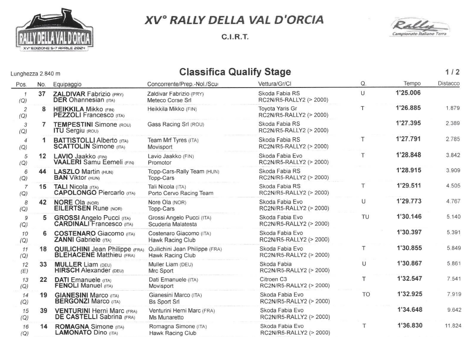 Terminata la Qualifying Stage al 15° Rally della Val d’Orcia si procederà ora, per i primi 10 equipaggi classificati durante la “fase di qualificazione”, alla scelta delle posizioni di partenza per affrontare la prima prova speciale della giornata di oggi, sabato 6 aprile.