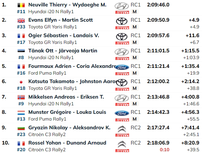 Neuville 18 punti – Evans 15 punti – Ogier 13 punti – Tanak 10 punti – Fourmaux 8 punti – Katsuta 6 punti – Mikkelsen 4 punti – Munster 3 punti – Gryazin 2 punti – Rossel 1 punto