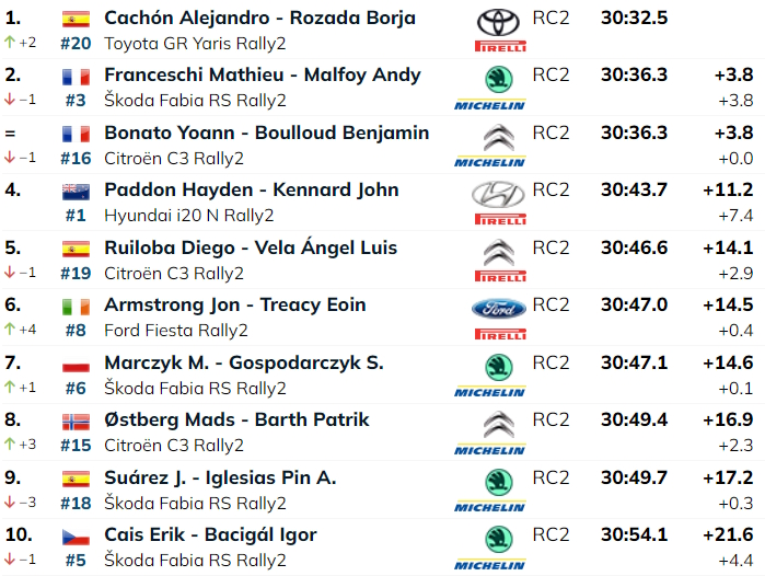 Ma lo spagnolo Cachón, alla guida della sua Toyota GR Yaris Rally2, è stato il pilota da battere nella PS3 Tajeda di 11,07 km, con il terzo tempo di speciale di Mathieu Franceschi sufficiente a farlo balzare, con la sua Škoda Fabia RS Rally2, al primo posto assoluto.