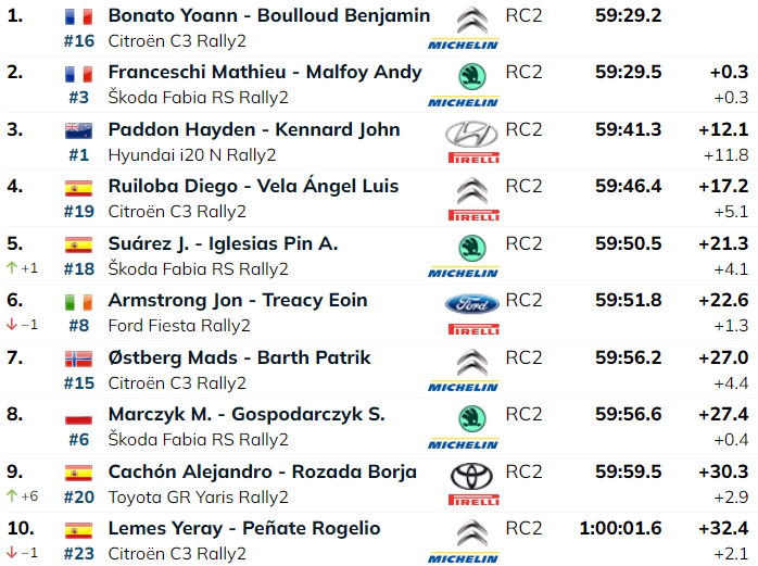 Al termine della tappa Bonato è al comando con la sua Citroen C3 Rally2, seguito da Mathieu Franceschi, con la Škoda Fabia RS Rally2, a soli 3 decimi ed appunto Hayden Paddon e la sua Hyundai i20N Rally2 staccato di 12.1 secondi. Cachón è in rimonta, grazie ai due scratch consecutivi, ed è provvisoriamente nono assoluto a + 30.3 secondi dalla vetta.