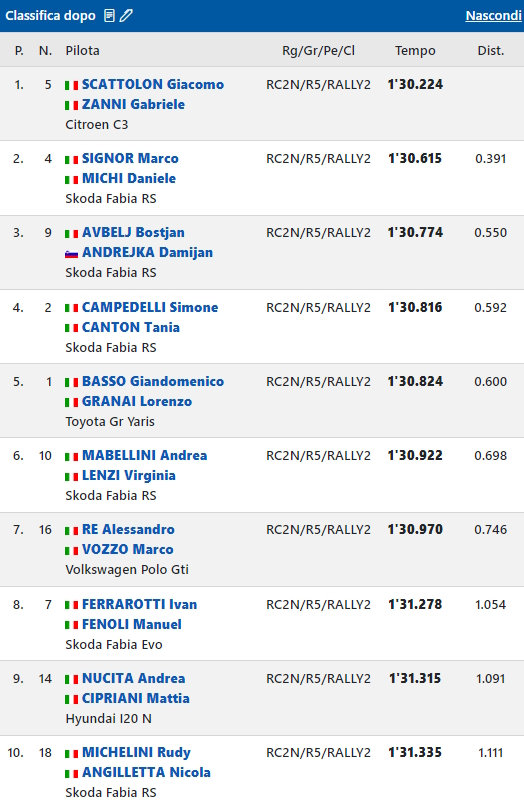 Per quanto riguarda i “top driver” del CIAR Paolo Andreucci e Rudy Briani sulla Citroen C3 Rally2 “pagano” 1.2 secondi al tempo di Basso, Simone Campedelli, insieme a Tania Canton su Skoda Fabia RS, arriva distanziato di 1.7 secondi dal leader, Andrea Crugnola e Pietro Ometto, sull’altra C3 Rally2 di F.P.F. Sport incassano 3.4 secondi da Basso.