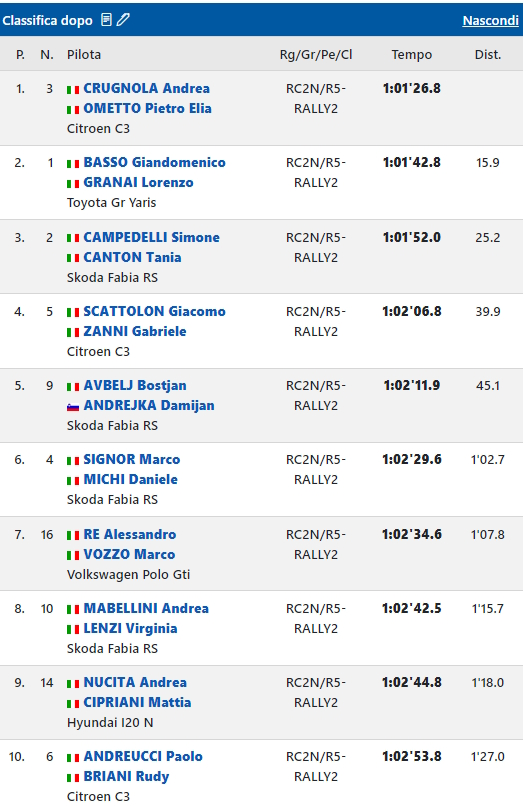 Questa la classifica provvisoria del CIAR dopo la terza gara: 1. Basso (Toyota GR Yaris Rally2) 45 punti – 2. Crugnola (Citroen C3 Rally2 ) 43,5 punti – 3. Campedelli (Skoda Fabia RS) 38 punti