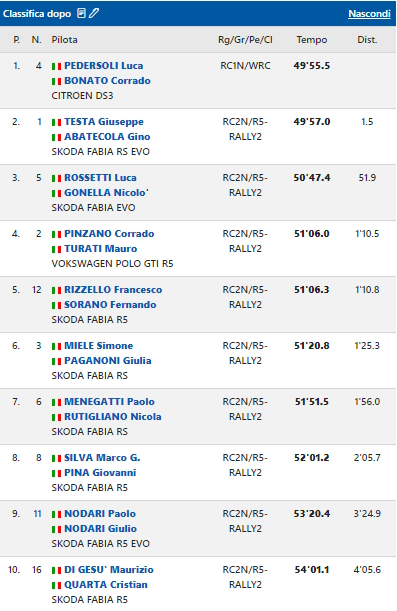 A cingersi il capo con la corona d’alloro, dopo sette combattutissime prove speciali delle otto originariamente in programma, è stato Luca Pedersoli, in coppia con Corrado Bonato, al via su una Citroen Ds3 Wrc. Quella del pilota lombardo è stata una gara entusiasmante, combattuta sul filo dei decimi di secondo con Giuseppe Testa e Gino Abatecola, secondi al termine. Il molisano e il frusinate, portacolori della scuderia Ro Racing, hanno risposto sempre egregiamente agli attacchi dei propri avversari, ma, dopo aver ceduto il testimone ai vincitori nella seconda tornata di prove, quella del pomeriggio, non sono riusciti a tornare in vetta per un solo secondo e cinque decimi, nonostante due scratch consecutivi nei due tratti conclusivi. Il forte pilota di Cercemaggiore, grazie alla piazza d’onore, ha incrementato il proprio vantaggio in classifica di Campionato e ha staccato la concorrenza.
