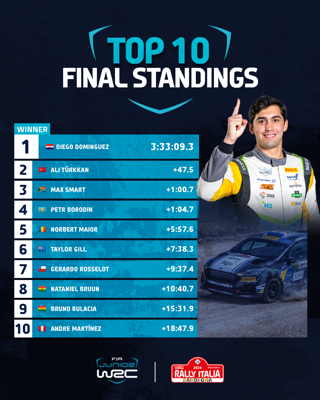 Un composto Diego Dominguez si è assicurato la sua seconda vittoria in carriera nel FIA Junior WRC al Rally Italia Sardegna, terminando il terzo round del Campionato con 47.5 secondi di vantaggio su Ali Türkkan