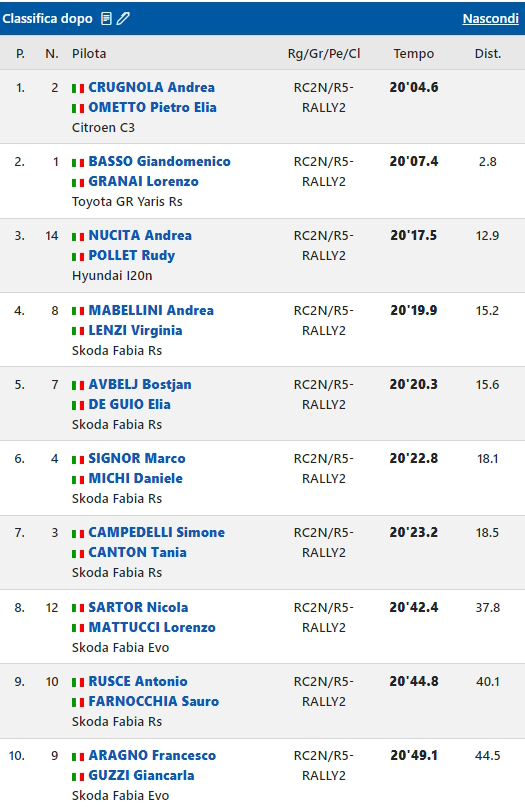 Dopo la prima Crugnola-Ometto si aggiudicano anche la seconda speciale, la Power Stage “Postuman” di 2,01 km, molto sporca a causa dei passaggi precedenti, dal momento che il tratto è stato utilizzato, in mattinata, per prove libere, Qualifying Stage ed anche shakedown. Un risultato che ha permesso a Crugnola, a bordo della Citroen C3 Rally2, di incassare anche i 2 punti bonus in palio. Due scratch consecutivi che hanno permesso a Crugnola-Ometto di rafforzare la loro leadership, portando il loro vantaggio provvisorio a 3.8 secondi sui primi inseguitori, Basso-Granai. Grazie a questa prestazione il pilota varesino torna nuovamente leader momentaneo del CIAR Sparco, in quanto l’equipaggio Toyota ha fatto siglare solo il 6° tempo di speciale, senza raccogliere punti bonus.