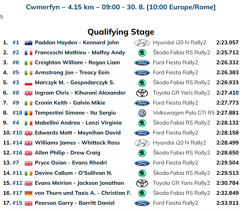 Nella prova di qualifica Hayden Paddon è riuscito a staccare il miglior tempo, 2’23.957. Il pilota neozelandese, leader del Campionato con la sua Hyundai i20N Rally2 gommata Pirelli, è poi seguito, nella classifica dei tempi, dal suo più diretto rivale per l’Europeo, il francese Mathieu Franceschi, con la Skoda Fabia RS Rally2-Michelin. staccato di 1.7 secondi, ed il Campione del Junior WRC William Creighton a 2.3 secondi con la Ford Fiesta Rally2.