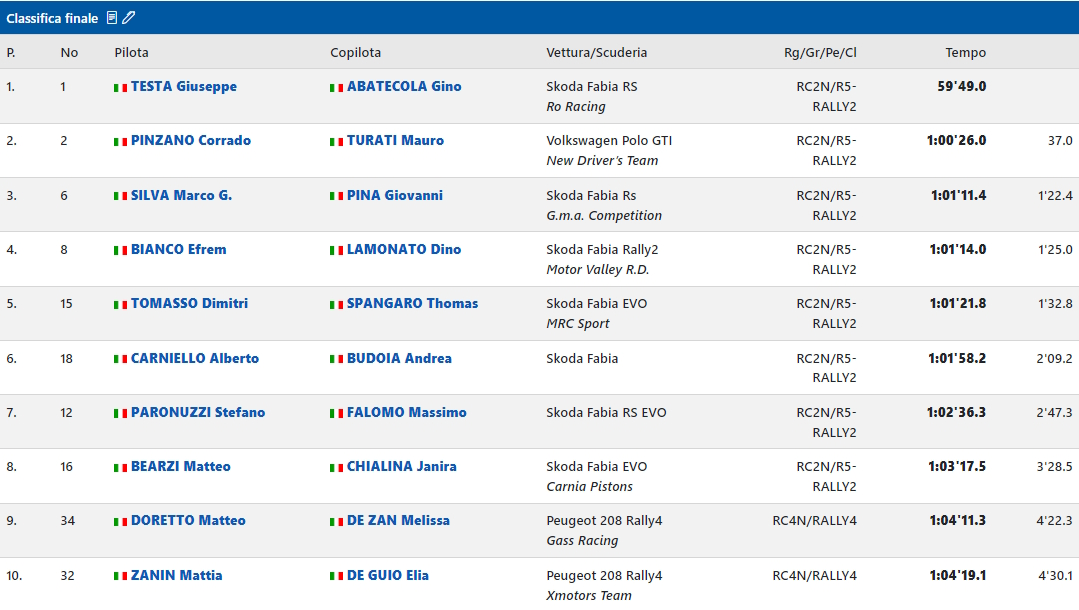Chiude al 4° posto assoluto Efrem Bianco, affiancato da Dino Lamonato su Skoda, pilota protagonista della Coppa Rally di 5° Zona che a lungo aveva occupato il gradino più basso del podio. Dietro di lui l’equipaggio Tomasso-Spangaro a 1’32.8 dal leader, seguito da Carniello-Budoia al sesto posto. La foratura sul finale di De Sabbata ha consentito a Paronuzzi-Falomo, alla prima gara su una Rally2, di concludere settimi assoluti davanti a Bearzi-Chialina, anche loro con poche gare di esperienza sulla Skoda Fabia.
