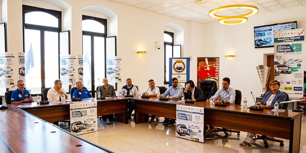 Per 327 Km di lunghezza dell’intero percorso, lungo 10 prove speciali cronometrate per complessivi 73,5 Km, le strade dei Comuni di Vieste, Mattinata, Peschici e Vico del Gargano vedranno rincorrersi 50 equipaggi, presenti nell’elenco iscritti del 14. Rally Porta del Gargano – 4. Trofeo Città di Vieste, chiuso alla mezzanotte di ieri. È l’evento conclusivo della Coppa Aci Rally 8° Zona, che con questa settima prova di stagione assegnerà la vittoria nell’area nazionale che comprende le regioni Abruzzo, Lazio, Campania, Molise, Puglia, Basilicata e Calabria. Questa è la struttura di gara che la ASD Piloti Sipontini, scuderia organizzatrice, ha presentato ieri, in Sala Consiliare del Palazzo Comunale di Vieste (nella foto sopra), alla presenza delle massime Autorità amministrative, riunite insieme ai rappresentanti dello Sport della Provincia di Foggia.