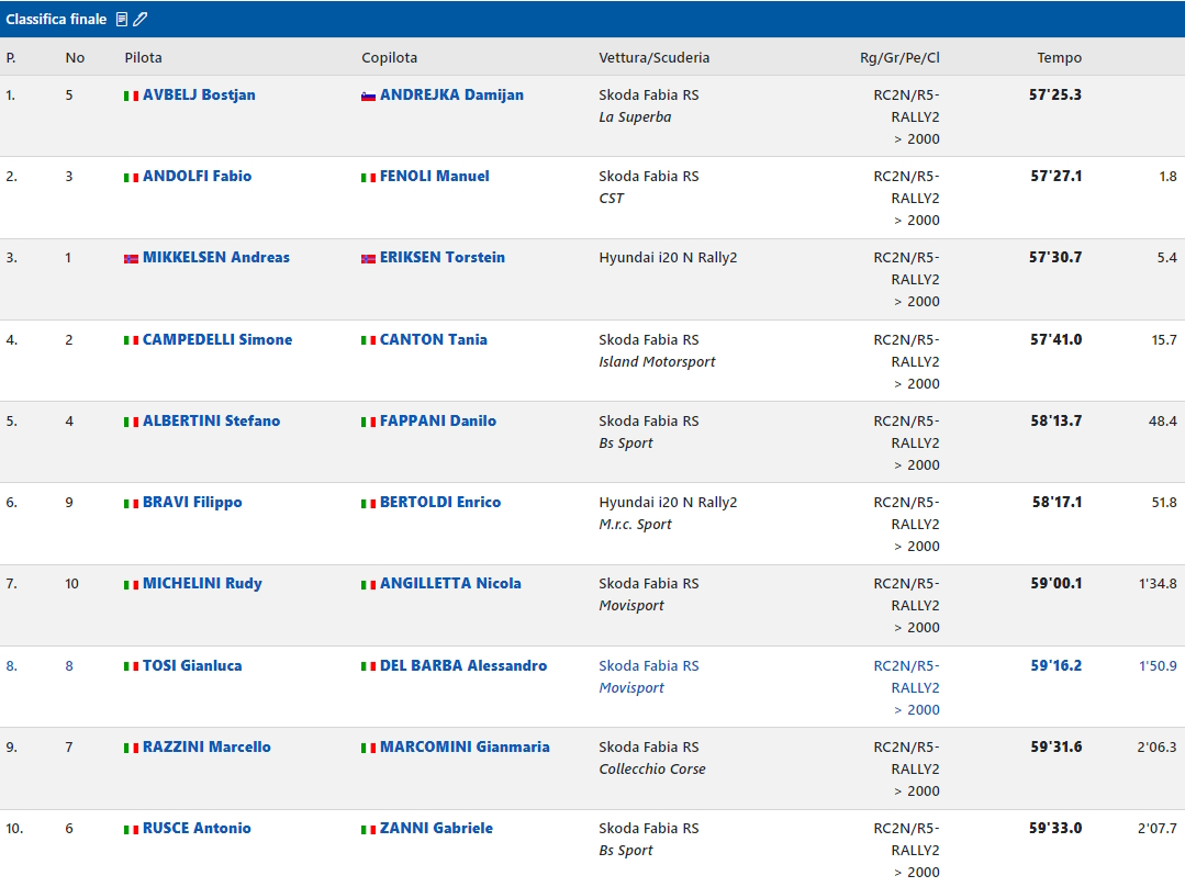 La gara friulana ha visto in sesta posizione assoluta Filippo Bravi, affiancato da Enrico Bertoldi sulla Hyundai i20 Rally2 del team Friulmotor. Alle spalle del driver locale si è classificato il toscano Rudy Michelini, sulla Skoda Fabia RS di MM Motorsport, vettura condivisa con Nicola Angilletta. Ottava posizione per Gianluca Tosi ed Alessandro Del Barba, su Skoda Fabia RS, vettura comune anche a Marcello Razzini e Gianmaria Marcomini, noni ad Ampezzo. La top ten è andata in archivio con la decima piazza occupata da Antonio Rusce e Gabriele Zanni, anch’essi su Skoda Fabia RS.