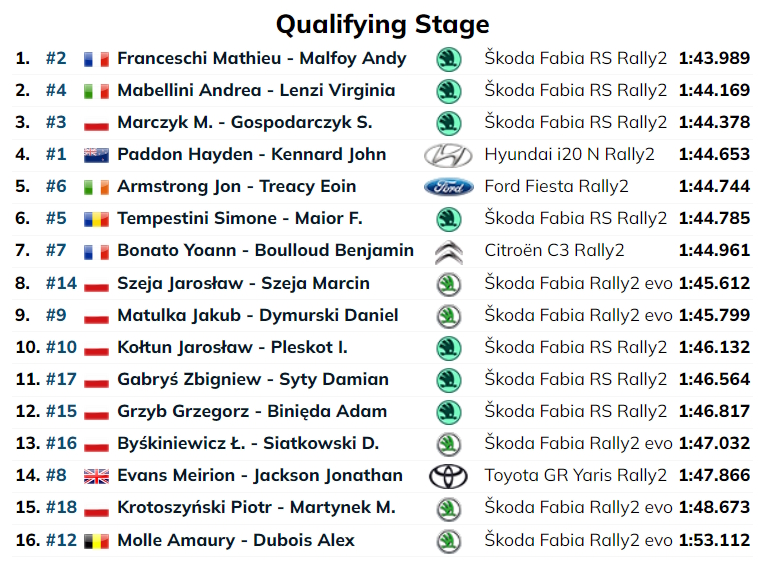 Nella prova di qualifica Mathieu Franceschi è riuscito a staccare il miglior tempo, 1’43.989. Il pilota francese, attualmente secondo in Campionato con la sua Skoda Fabia RS Rally2 gommata Michelin, ancora possibile vincitore dell’Europeo, è poi seguito dal “nostro” Andrea Mabellini, in coppia con Virginia Lenzi su analoga vettura del Team MRF Tyres. staccato di appena 2 decimi, e dal “padrone di casa” Miko Marczyk ad altri 2 decimi, con un’altra Skoda.