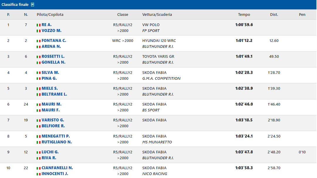 Ma la vittoria finale è andata al “figlio d’arte” della famiglia Re, capace di sferrare l’attacco nelle prove corse in notturna e di presentarsi al via della seconda giornata di gara con un buon vantaggio da gestire e, con il Trofeo Italiano Rally già nelle mani di Corrado Pinzano e Mauro Turati, i due equipaggi di casa si sono potuti scontrare a suon di scratch per la vittoria.