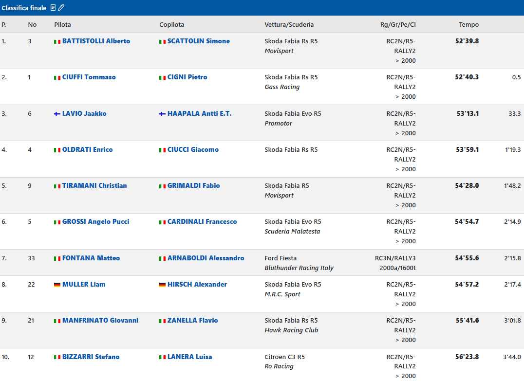Dalla prima alla penultima delle sei prove in testa alla classifica della gara, valida come quinto e penultimo round del Campionato Italiano Rally Terra, c’era il toscano Tommaso Ciuffi che, navigato da Pietro Cigni su un’altra Skoda Fabia RS Rally2, aveva già vinto quattro speciali e, al termine della “Alà dei Sardi-Buddusò 2”, aveva 10 secondi di vantaggio sul vicentino. Un margine che non è bastato a restare primo, dopo la Pattada-Oschiri 2, perché su quei venti chilometri cronometrati Battistolli ha colmato il gap e accumulato il mezzo secondo di vantaggio che gli è valso un successo che sembrava ormai irraggiungibile.