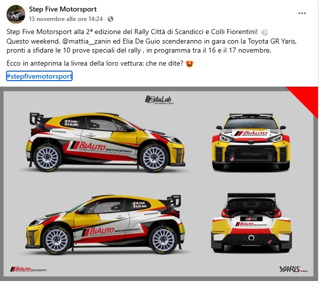 Questo fine settimana, sabato 16 e domenica 17 novembre, andrà in scena la seconda edizione della gara toscana. Al via anche Mattia Zanin, al debutto su una 4 ruote motrici, la GR Yaris Rally2