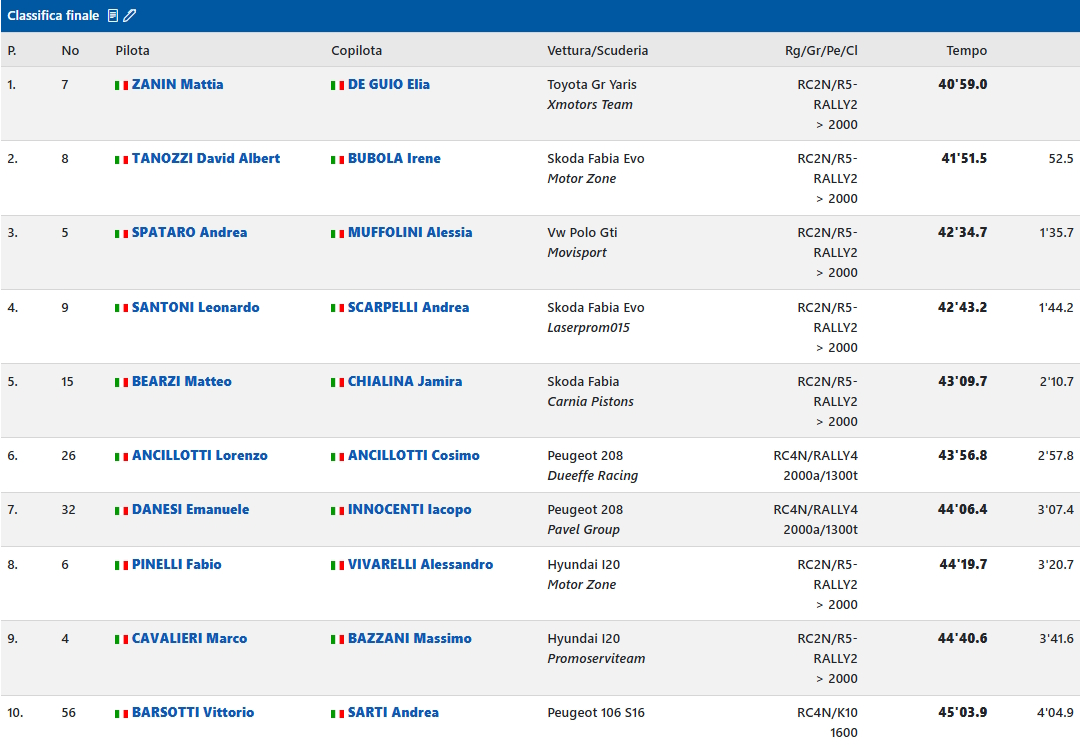 Primo posto arrivato con ampio merito, confermando il valore della coppia che quest’anno è stata peraltro impegnata nel Campionato Europeo Rally per la prima volta, mentre dietro si è scatenata un’accesa e spettacolare bagarre che, purtroppo non ha visto lottare uno degli attesi protagonisti, il fiorentino Alessandro La Ferla, già out durante la seconda prova per uscita di strada con la sua Skoda Fabia, condivisa con Pellegrini. Alla fine, dal tourbillon di duelli che ha animato soprattutto la parte centrale della gara, la seconda moneta è andata in mano ai livornesi David Albert Tanozzi e Irene Bubola, Skoda anche per loro, partiti quinti e poi autori di una decisa progressione che li ha fatti salire con merito sul podio, precedendo il lariano Andrea Spataro, terzo con Alessia Muffolini alle note, su una VolksWagen Polo R5. Se Tanozzi aveva già corso a Scandicci, sfiorando il podio alla prima edizione, Spataro è stata un’altra bella rivelazione della sfida, in quanto non aveva mai visto prima le strade affrontate, forte del suo background di tutto rispetto, essendo un “nome” che va costantemente a podio nelle gare del Nord Italia.