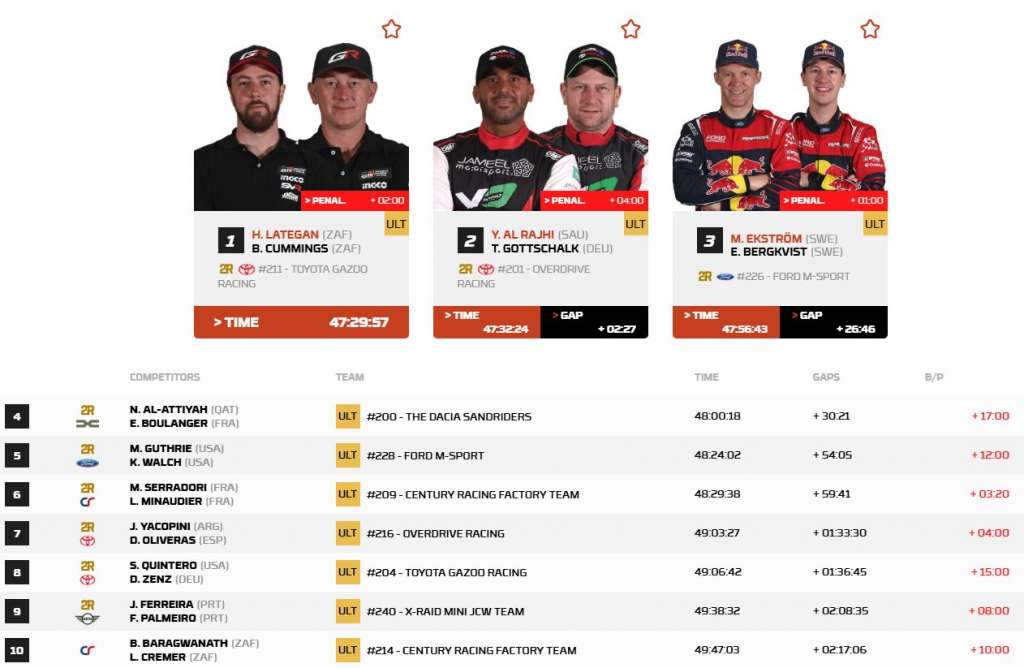Come detto, i piloti favoriti per la vittoria finale hanno scelto di adottare una strategia piĂą conservativa in vista della tappa difficile di domani. Così, Henk Lategan si è piazzato 22° in classifica, Mattias Ekström 46°, Yazeed Al Rajhi 50° e Nasser Al Attiyah 53°. La buona prestazione di Lategan gli ha permesso di recuperare i 7 minuti di distacco da Al Rajhi, superandolo e tornando in testa alla classifica generale con 2’27” di vantaggio.