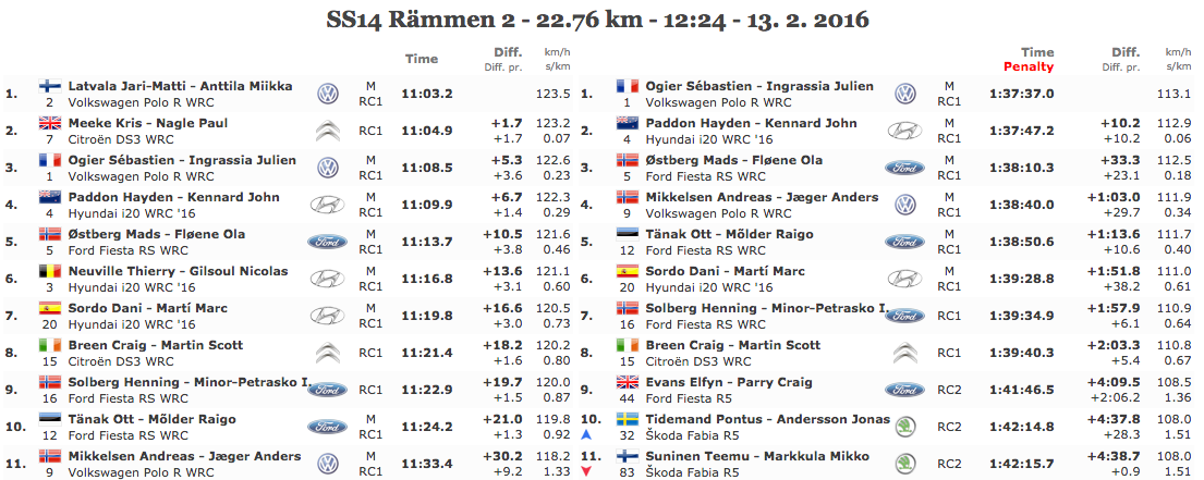 Secondo giro fatale sulla Rämmen per Andreas Mikkelsen. Il generoso pilota norvegese sta spingendo al massimo per conquistare il podio ai danni di Mads Ostberg ma a pochi chilometri dallo stop è incappato in un errore, perdendo oltre 20 secondi.