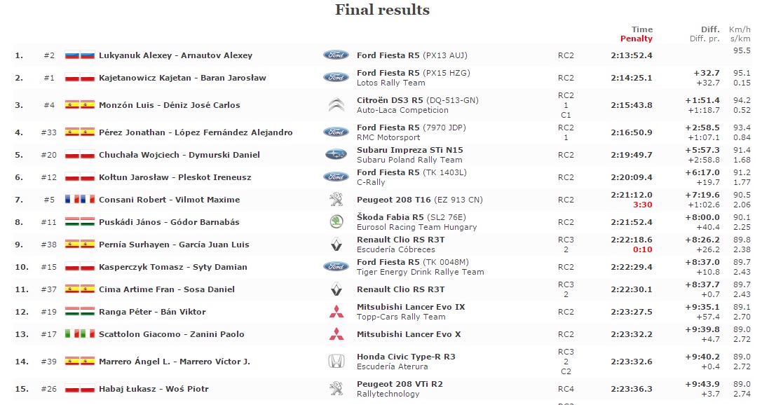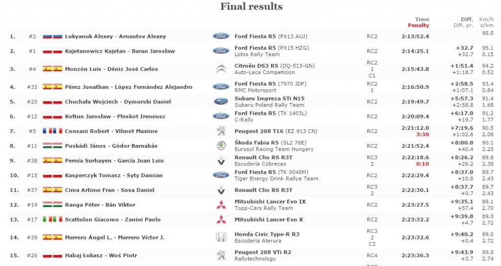 Si conclude col trionfo dell’equipaggio Lukyanuk-Arnautov il primo rally stagionale ERC Islas Canarias. Il team russo alla guida di Ford Fiesta R5 vince a bordo di è balzato in testa nella PS9 aumentando il vantaggio nella PS10. Successivamente si difende alla grande dalla pressione del campione in carica Kajetanowicz, riuscendo a vincere 4 PS in totale e chiudendo primo con 32″7 di vantaggio. Oltretutto la squadra vincente ha pure avuto problemi con la pressione delle gomme Pirelli.