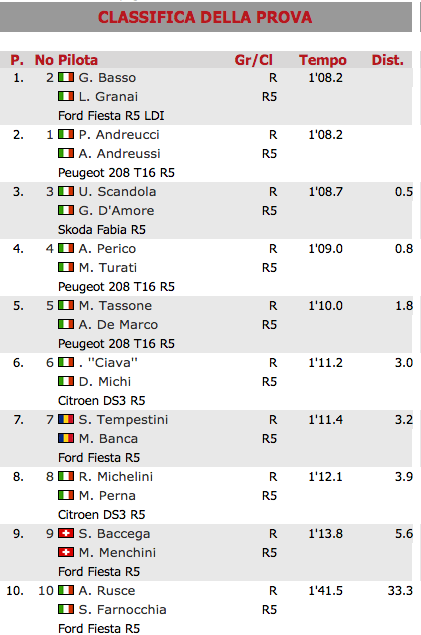 Chiaramente si è trattato di una prova più per gli spettatori e per avvicinare più gente al popolo dei rally. Terza piazza per Umberto Scandola, seguito da Alessandro Perico vincitore dell’edizione 2015 e Michele Tassone. Vediamo la tabella dei tempi dei primi 10 scesi in speciale.
