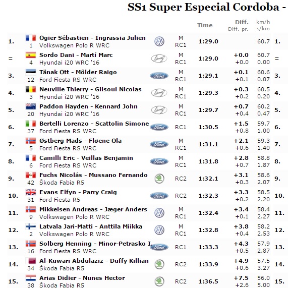 E’ entrato nel vivo il Rally d’Argentina, quarto appuntamento mondiale, che ha visto correre la PS1, la Super Speciale di Cordoba. Si è conclusa con un incredibile pareggio fra il pilota VW e leader del mondiale Seb Ogier e il pilota Hyundai Dani Sordo. Staccato di appena un decimino il pilota DMACK Ott Tanak. Completano la top five i restanti Hyundai, rispettivamente Neuville al quarto e Paddon al quinto tempo.