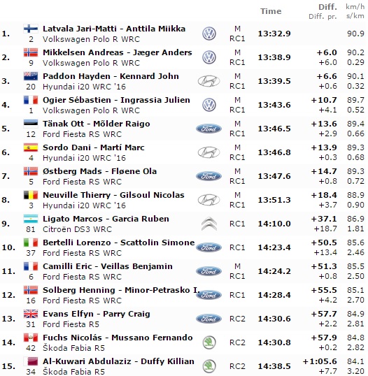Altra PS dal buon chilometraggio che ha visto trionfare il momentaneo leader della classifica generale Jari Matti Latvala a bordo delle VW Polo. Al secondo posto si fa vedere il compagno di scuderia Andreas Mikkelsen. Segue, dopo la vittorie delle due precedenti, il pilota neozelandese della Hyundai, Hayden Paddon. Ogier firma il quarto tempo, ma a quasi 11 secondi di ritardo dal primo in classifica.