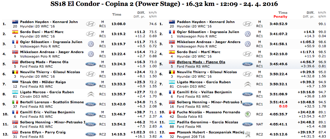 Gara decisa durante l’ultima giornata e nella decisiva prova di El Condor. Al primo passaggio le condizioni meteo sono proibitive con nebbia e polvere che rendono difficilissime le condizioni tra un pilota e l’altro. Paddon scende in gara con un po’ di “braccino”, stranamente impreciso e falloso. Perde oltre 7 secondi e aiuta Ogier a prendere coraggio e a portarsi a soli 2.6 secondi prima della Power Stage.
