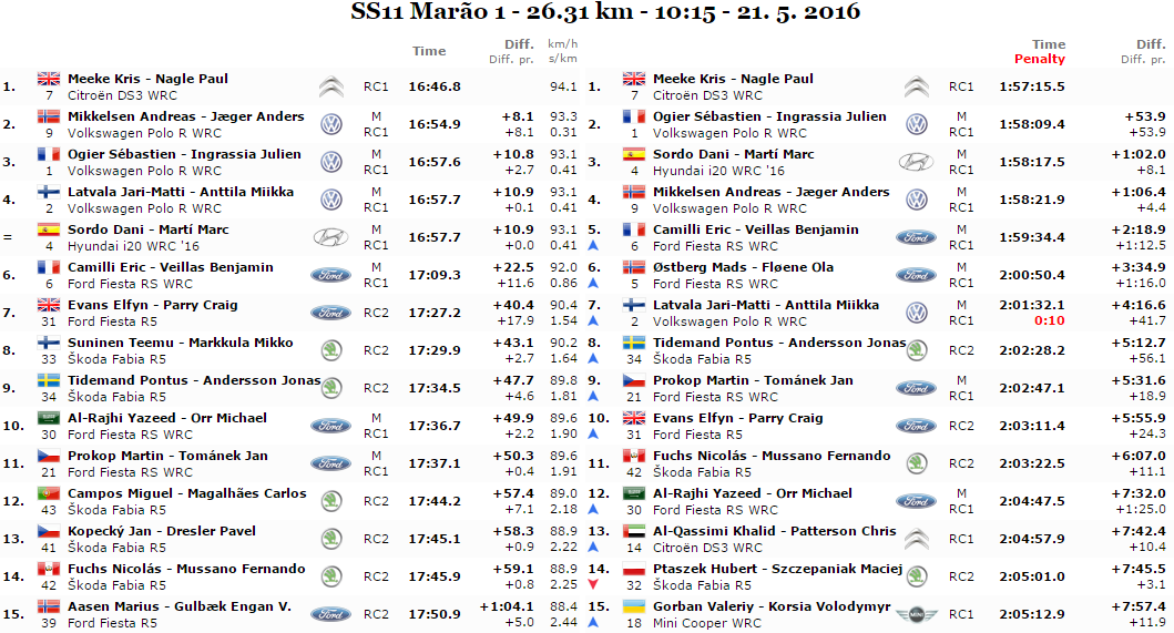 Conclusasi anche la lunga PS11, “Marao1” di 26,31km. Svetta su tutti ancora una volta il pilota Citroen Meeke. Secondo Mikkelsen e terzo a controllare Ogier. Si rivede dalle parti alte, Latvala posizionatosi quarto.