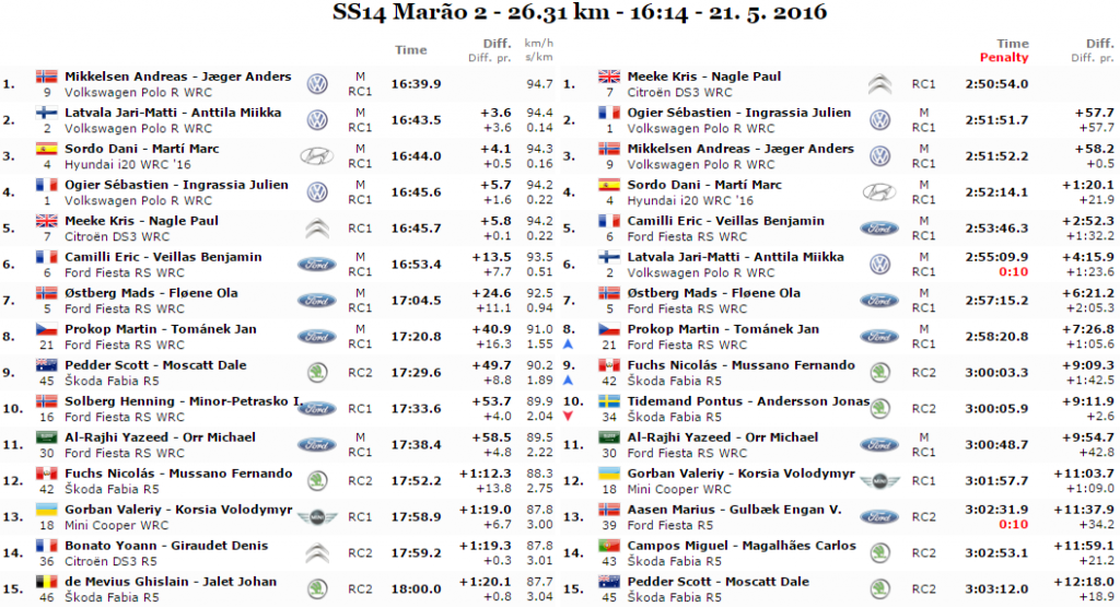 Ottime prove per le VW. Nella PS13 tripletta Polo con il giovane Mikkelsen su Latvala e Ogier. Quarto Meeke che difende. Nella PS14 si riconferma Mikkelsen su Latvala e questa volta il pilota Hyundai, Dani Sordo a completare il podio. Seguono Ogier e Meeke che comunque sia mantiene quasi un minuto di vantaggio sul campione in carica francese nella classifica generale della gara. Pare proprio che il britannico della Citroen cominci ad amministrare il vantaggio incamerato finora.