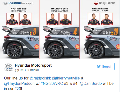 Mancano 10 giorni all’evento nazionale dell’anno, il Rally Italia Sardegna, sesto evento del World Rally Championship 2016 ma la squadra Hyundai Motorsport ha già presentato la line up ufficiale definitiva per il Rally di Polonia.