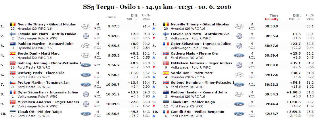 Classifica generale invariata con podio formato da Neuville, Latvala e Ogier staccato di 24 secondi.