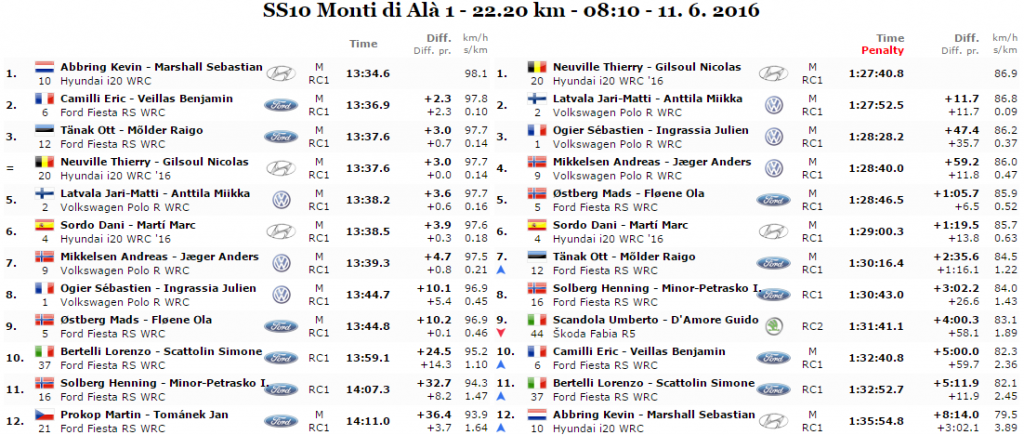 Secondo giorno di gara vera e propria e la sveglia la dà chi non ti aspetti, Kevin Abbring. Il giovane Hyundai del team Mobis, fa segnare, contro ogni pronostico, il miglior tempo. Dopo la giornata opaca di ieri, oggi sembra aver trovato il feeling giusto per arrivare primo durante la prima PS di giornata, ovvero la n.10 Monti di Alà 1 di 22,20 km.