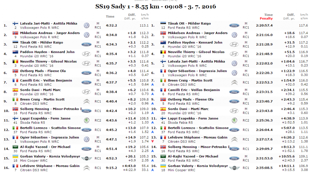 Seconda speciale della mattinata, la n.19 “SAdy1” di 8,55km che ha visto un bel guizzo di Latvala che non ci sta proprio a farsi soffiare il quinto posto dal rivale di squadra Ogier. Vince, mentre Tanak, terzo a 2 secondi difende il primato. Mikkelsen mette in cassaforte il suo secondo gradino del podio con un ottimo secondo posto di speciale. Paddon e Neuville ci provano ma continuano a essere rispettivamente terzi e quarti.