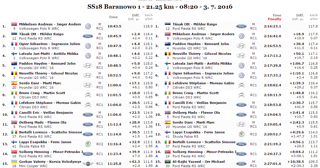 Il norvegese ha messo in fila Tanak distaccato di 2 secondi e mezzo e Sebastien Ogier, finalmente a podio di speciale, ma staccato di oltre 4 secondi. Il leader del campionato della VW, cerca di recuperare più posizioni possibili in queste ultime prove rimaste. Ormai il podio sembra definito, ma cercherà di scalzare il compagno di squadra Latvala, che occupa la quinta postazione nella generale e cercare un attacco disperato a Neuville, quarto ma distante una ventina di secondi.