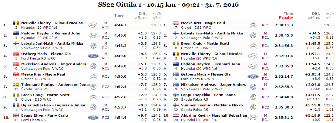 Comunque la speciale è stata vinta dal pilota belga della Hyundai, Thierry Neuville, seguito a ruota dal compagno di squadra Hayden Paddon. A questo punto della gara sono loro i pretendenti al gradino più basso del podio occupato sempre dal pilota Citroen, Craig Breen che termina ottavo a 8 secondi dal leader. Latvala è terzo, mentre Meeke sempre più in controllo e con la vittoria in pugno.