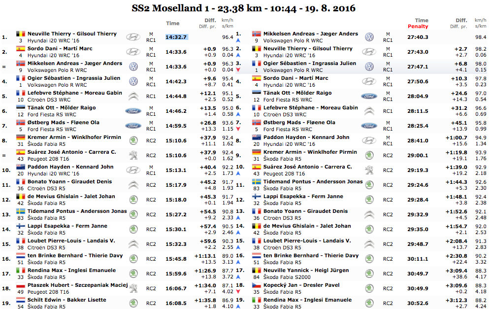 La prova miete vittime illustri sia nel WRC che nelle categorie inferiori. Esce di strada la Ford M-Sport di Camilli  che incappa nell’ennesimo errore di stagione mentre sbattono nelle strette strade della Mosella Maurin, Giordano e Suninen. Errori non determinanti ma che comunque generano forti ritardi anche per Ostberg e Lefebvre con l’unica Citroen DS3 WRC in gara.