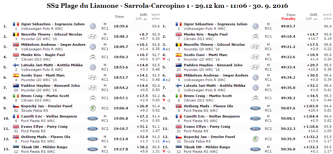 Sembra inarrestabile Ogier, alza il ritmo, guida bene e si lascia alle spalle il primo pilota Hyundai, Thierry Neuville staccato di quasi 9 secondi. Completa il podio il norvegese VW, Andreas Mikkelsen in ripresa dopo una prima prova un po opaca.