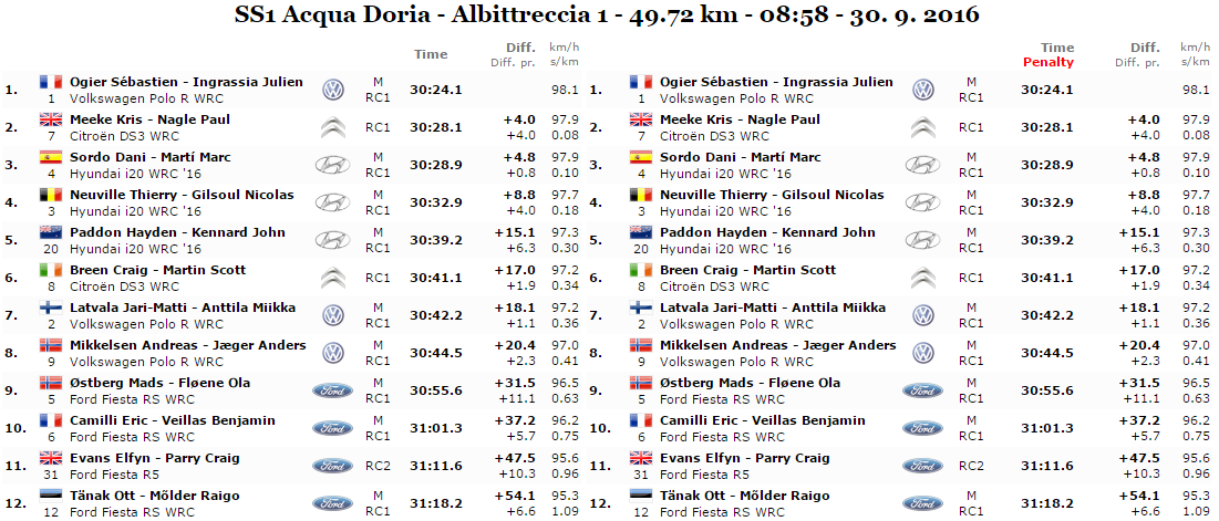 E’ cominciato il primo giorno di Gara in Corsica. Si è appena disputata la PS1, la lunga Acqua Doria-Albittreccia di ben 49,72 km. Speciale completamente inedita, caratterizzata da numerosi tratti veloci, sinuosi, ma anche diverse salite e percorsi su asfalti sconnessi. Paesaggio spettacolare.Comunque, i giochi sono iniziati e a primeggiare è subito il pilota VW, nonchè leader del mondiale, Sebastien Ogier che comunque a termine della prova dichiara di essere stato troppo cauto e che comunque aprire la gara non è mai facile.