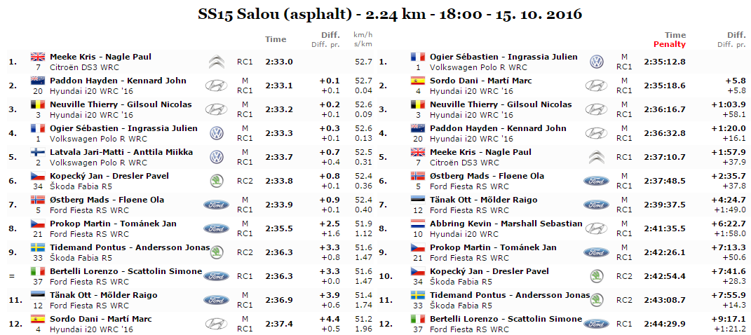 La giornata al Rally di Spagna si conclude poi con la prova su asfalto n. 15 la “Salou” di 2,24 km. La breve speciale è stata vinta dal pilota Citroen Kris Meeke, ma i tempi sono tutti praticamente lì. Podio completato dal duo Hyundai Paddon-Neuville. Nessun stravolgimento nella generale dove Ogier guadagni ulteriori 4 secondi su Sordo.