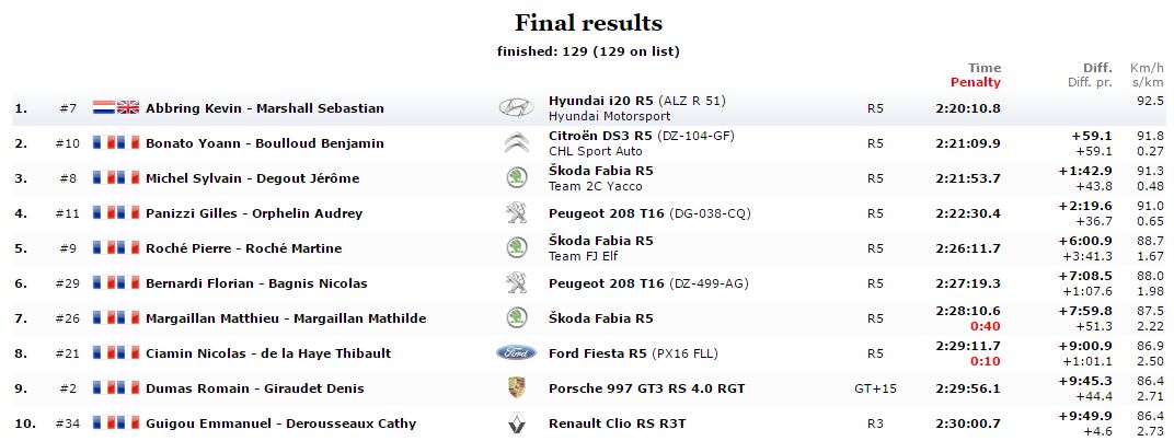 A dire il vero la gara era ben incanalata verso la vittoria dell’asso di casa Citroen Stephane Lefebvre (che vedeva il ritorno di Gabin Moreau al suo fianco dopo il tremendo botto in Germania) ma sulla prova speciale numero 6, complice la rottura di un semiasse, sbatteva la sua Citroen e perdeva più di mezzo minuto. Gara piuttosto insidiosa e scivolosa con tanto fango finito sulle prove speciali.