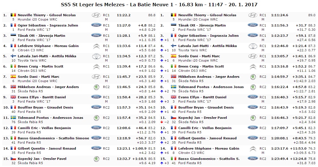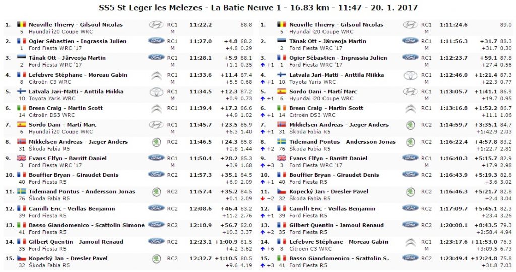 La mattinata di gara si è conclusa con la PS5 “ST LEGER LES MELEZES – LA BATIE NEUVE 1” di 16,83 km. Lo start è stato posto un chilometro prima rispetto all’edizione 2016 in modo da consentire ai piloti di passare attraverso Saint-Lèger-les Mèlèz. La salita per il Col de Moissière (1574 m) è veloce malgrado dei punti stretti e disturbati dal vento. La discesa nella foresta di Sapet è invece molto sinuosa con alcuni tratti sconnessi che se innevati possono regalare sorprese. Infine la strada verso la Batie-Neuve è larga e presenta dei tornantini”. Si parte da 1219 metri si scollina a 1574 e si arriva a 930 m.