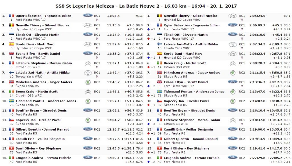 Passiamo invece ad una movimentata ripetizione della PS7, ASPRES LES CORPS – CHAILLOL 2 di 38,94 km. Sornione Neuville che chiude quarto, ma da segnalare c’è il tempone di Seb Ogier che vince la stage e rifila ben 20 secondi al belga della Hyundai. Segue l’altra Ford, quella di Tanak che prende quasi 15 secondi dal suo caposquadra. Completa il podio di speciale Jari-Matti Latvala terzo. Tutto invariato comunque nella classifica generale.