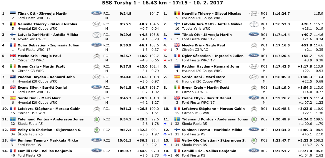 La giornata si è chiusa con la PS8  Torsby 1 di 16,43 km. Ad avere la meglio è stato l’estone della M-Sport che si toglie la soddisfazione di vincere la speciale tenendosi francobollo l’attuale leader della generale Thierry Neuville. Latvala, nonostante le gomme lisce e problemi di scivolamenti e traversi chiude terzo staccato però di oltre 4 secondi dal duo di testa. Tiene saldo comunque il secondo posto nella generale.