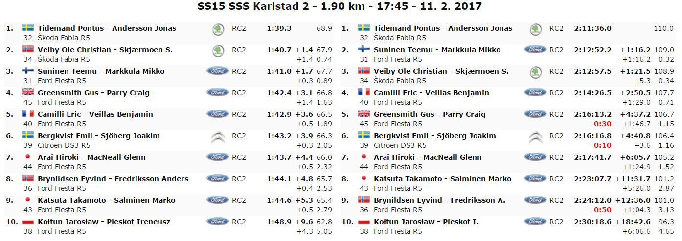 Uno su tutti, lo svedese di casa Skoda Pontus Tidemand. Il ventiseienne di Charlottenberg sta sfruttando al meglio l’assenza dei “caposquadra” che lo hanno limitato in quel di Montecarlo, confermando al vertice i colori della casa ceca anche nel secondo rally di questo mondiale. La prima posizione di Tidemand sembra in cassaforte, anche se niente può esserlo dopo quello accaduto pochi istanti fa nella prova spettacolo; lo svedese si è aggiudicato tutte le prove speciali di oggi meno una, finita nelle grinfie di Ole Christian Veiby al volante di una Fabia privata.