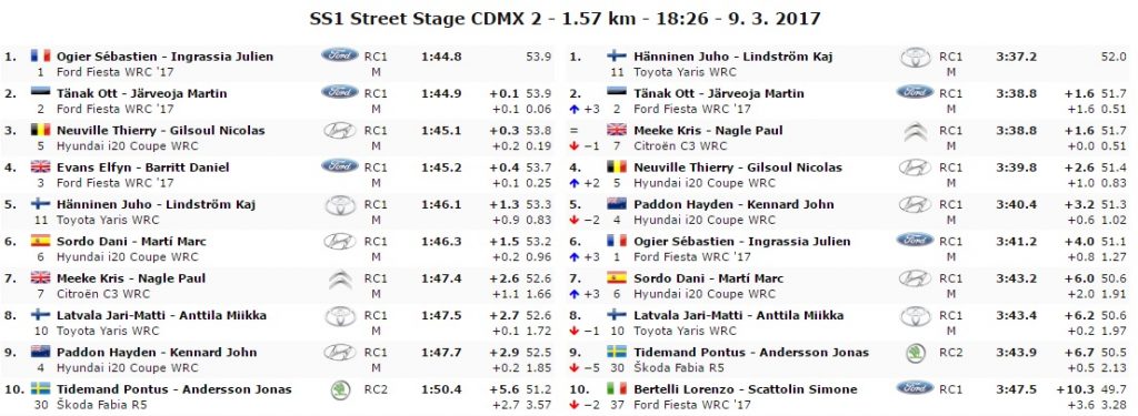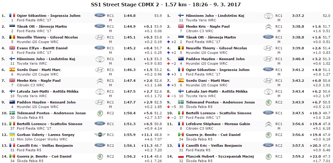 Il francese chiude davanti al compagno di squadra, francobollato a solo un decimo.Completa il podio il belga della Hyundai, Thierry Neuville. Il vincitore della precedente, Hanninen, si piazza quinto alle spalle di un funambolico Elfyn Evans che ha già iniziato a picchiare duro visti i 5 minuti di penalità da recuperare dovuti alla rottura del motore nella prima prova. Settimo tempo per Meeke e ottavo per Latvala. Il britannico perde il secondo posto nella generale a favore del pilota Ford, Ott Tanak secondo in entrambe le prove.