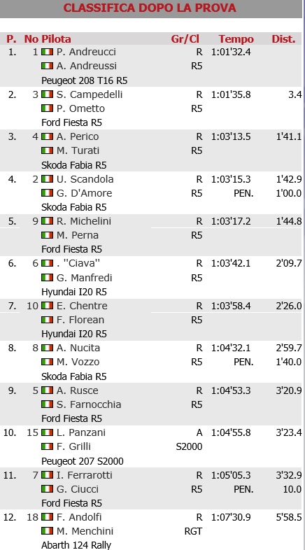 Giornata conclusa con la PS13, “Noi TV 2” di 1,90 km. E’ ancora Campedelli a suonare la carica, vince l’ultima speciale davanti ad Umberto Scandola e a Paolo Andreucci che porta casa la prima tappa con un vantaggio di 3,4 secondi proprio sul romagnolo di Orange1. Nonostante l’ottimo tempo del veronese della Skoda, è Alessandro Perico a completare il podio. Quarta piazza quindi per Scandola che ha preceduto Michelini e Ciava. Nucita nonostante il quarto posto si è mantenuto in ottava postazione a causa della penalità.