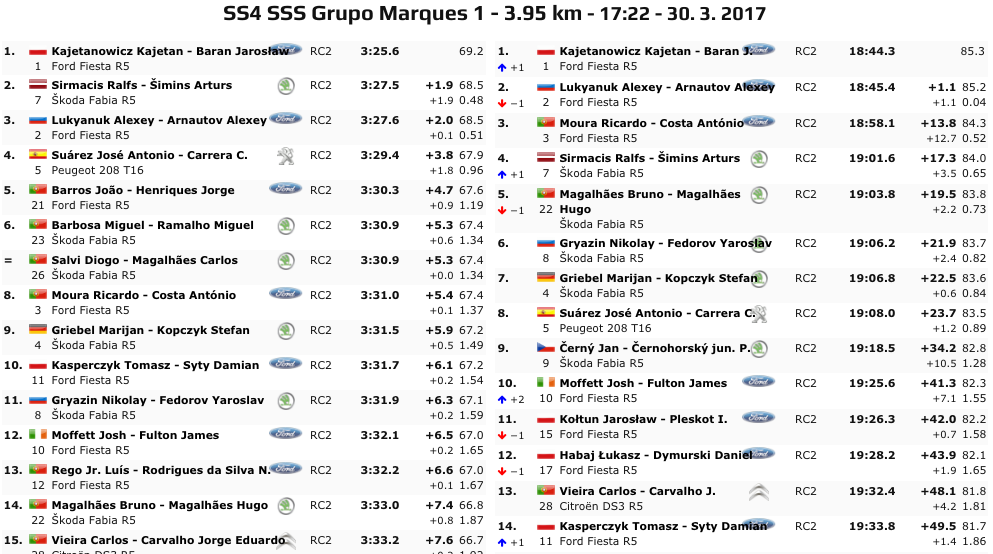 Nonostante sia solo una prova spettacolo, è stata la PS4 SSS Grupo Marques 1 di 3.95 km a rimescolare le fiches con “il polacco” che mangia 2 secondi ” allo zar russo” e si porta al comando della classifica con solo però 1.1 secondi di vantaggio. Terzo è Ricardo Moura (+13.8), quarto Ralfs Simracis (+17.3) e quinto Magalhaes a + 19.5 sec.