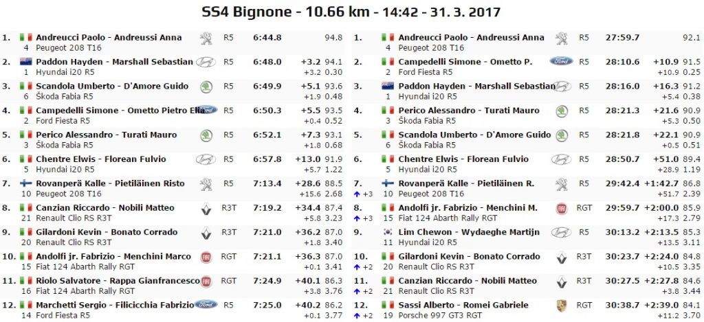 La prima parte di gara termina con la PS4, ripetizione della Bignone. Andreucci saldo in testa vince PS e ribadisce la leadership della gara allungando sugli avversari. Secondo tempo per un ottimo Paddon il quale si rivela divertito e compiaciuto della gara che sta svolgendo. Resta in terza posizione nella generale il neozelandese. A completare il podio dell’ultima PS della prima parte di gara è stato Scandola con la Fabia R5. Il veronese ha preceduto Simone Campedelli che chiude quarto, ma resta saldo al secondo posto della generale.