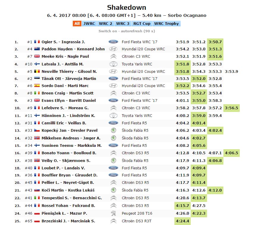 Tra le WRC2 il miglior tempo è del pilota di casa Eric Camilli che precede Jan Kopecky e Andreas Mikkelsen. 22° tempo assoluto per il nostro Simone Tempestini (11° di categoria) che prende confidenza con la Citroen DS3 R5 nei tortuosi asfalti della Corsica.