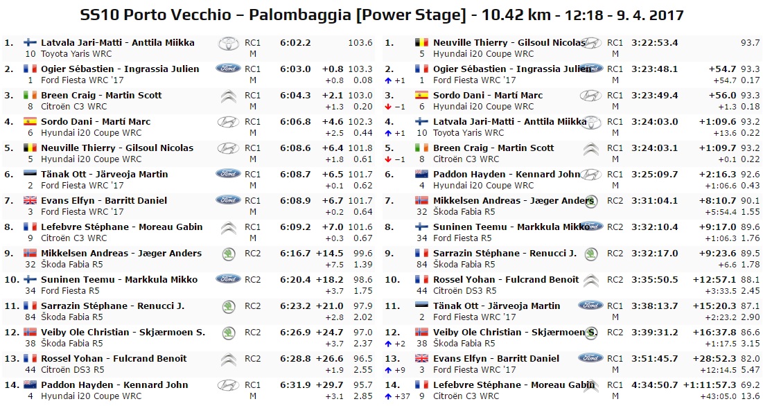 La gara si è poi conclusa con la PS10, la Power Stage di “Porto Vecchio – Palombaggia” (10.42 km). A far sua la prova e far bottino anche dei punti della Power Stage è stato inaspettatamente JML con la Toyota. Neuville chiude quinto pensando più alla vittoria che agli ulteriori punti. Francobollato al finlandese c’è Ogier che grazie alla brillante prova finale supera Dani Sordo quarto a 5 secondi. Completa il podio della Power Stage un esaltante Craig Breen terzo. Purtroppo per l’irlandese è sfumato il quarto posto a favore di Latvala vincitore della stage.
